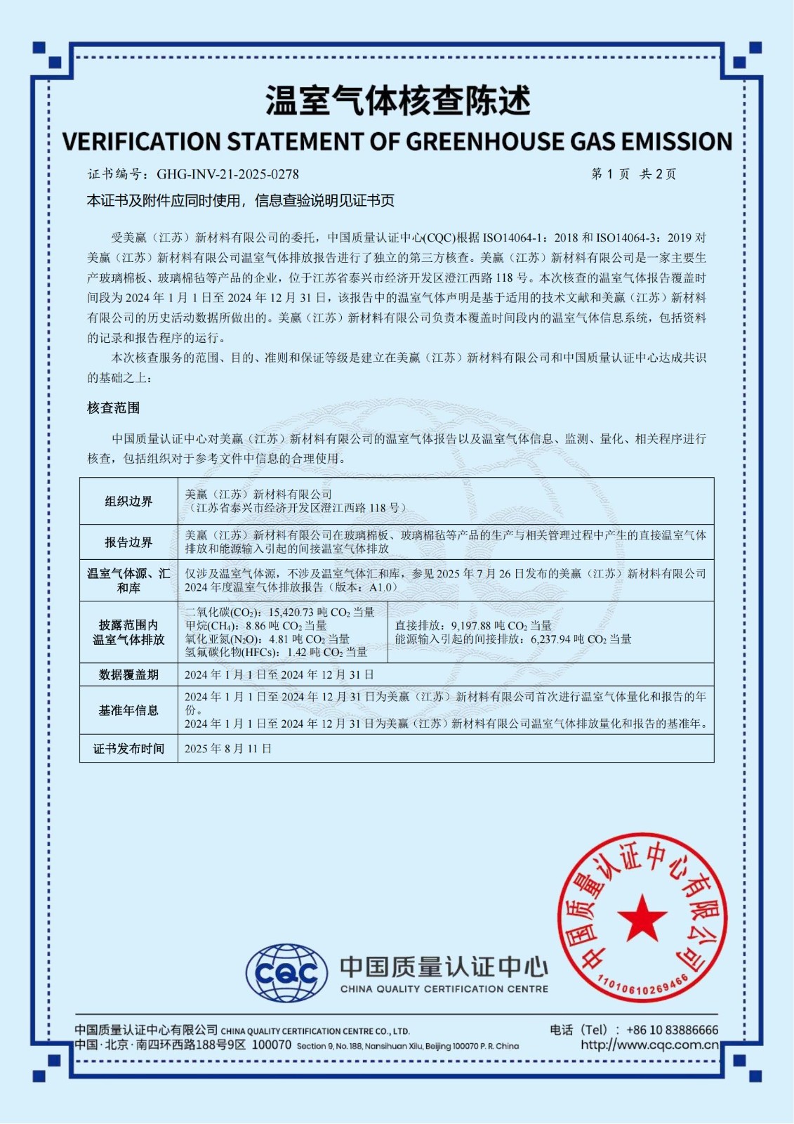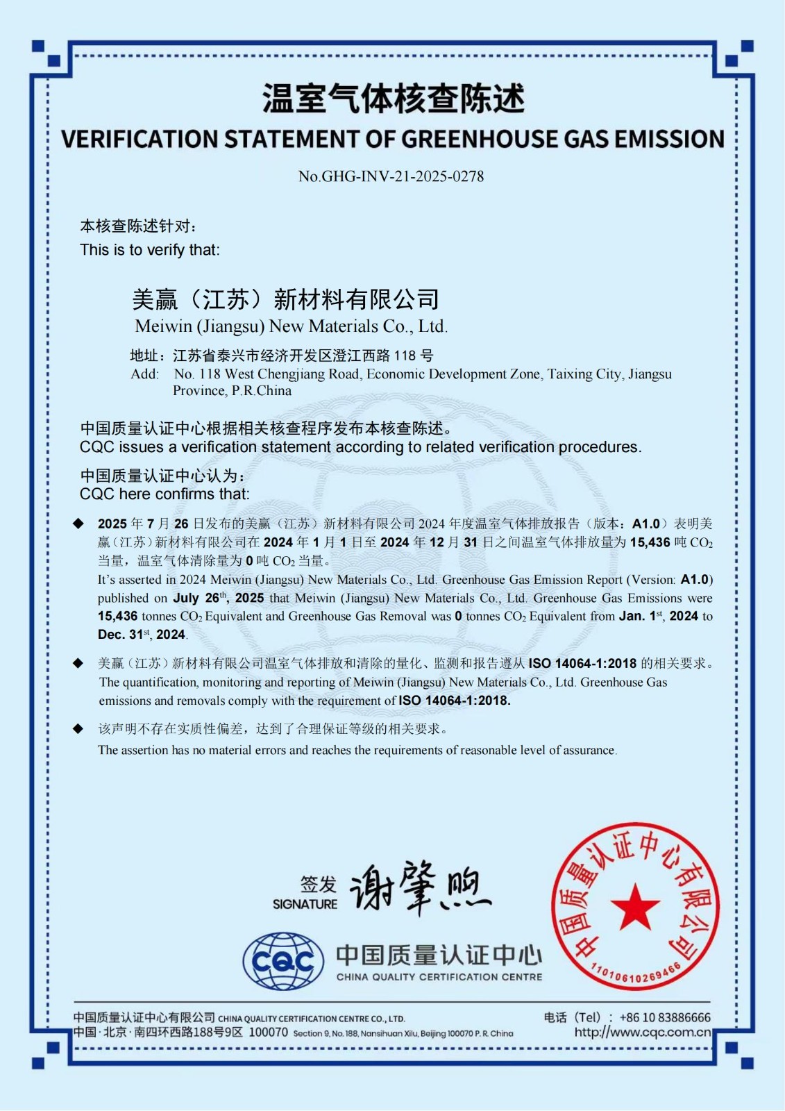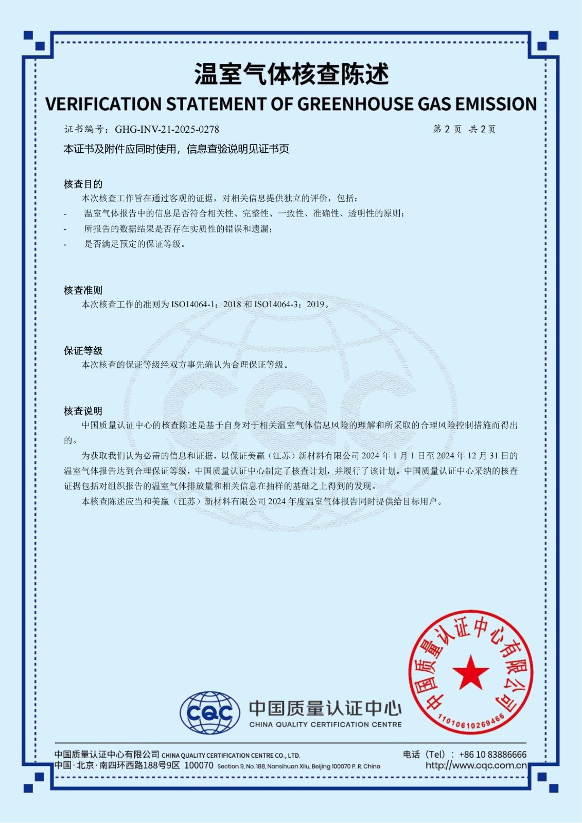 贏勝旗下全資子公司美贏(江蘇)新材料有限公司通過 CQC 溫室氣體核查陳述并獲得產(chǎn)品碳足跡認證